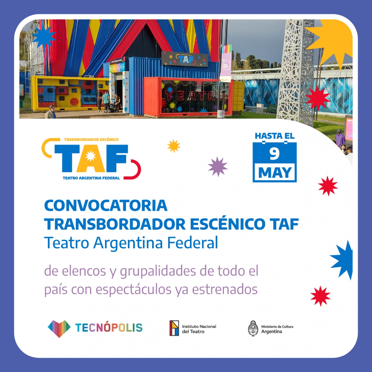 El Instituto Nacional del Teatro (INT) , es el organismo del Ministerio de Cultura y la Secretaría de Gestión Cultural que abre la convocatoria a elencos de todo el país con espectáculos ya estrenados, a postularse hasta el 9 de mayo de 2022, para formar parte de la base de espectáculos y actividades escénicas especiales, sobre la cual se conformará la programación del Transbordador Escénico TAF - Teatro Argentina Federal.